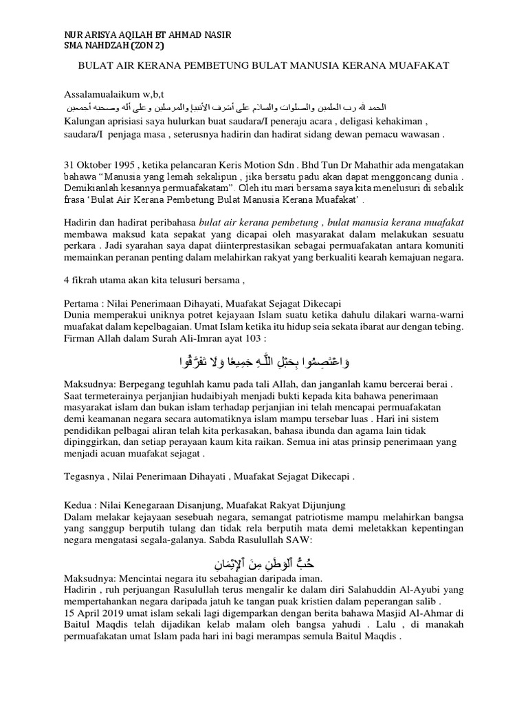 Sediakan teks syarahan tersebut dengan lengkap. BULAT AIR KERANA PEMBENTUNG BULAT KITA KERANA MUAFAKAT Assalamualaikum dan salam muafakat 1. Ms 99 spm 2017 24.