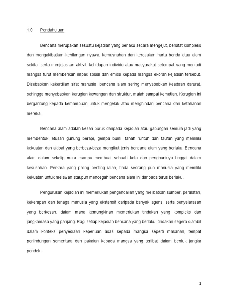 Namun kini ia banyak dikaitkan dengan aktiviti manusia yang membawa kepada perubahan drastik terhadap sifat-sifat semulajadi alam. Kesan Bencana Alam 1. Usaha mengurangkan mitigating efforts perlu diberi tumpuan agar kesan langsung jangka sederhana dan jangka panjang bencana dapat dikurangkan ke tahap yang paling minimum.